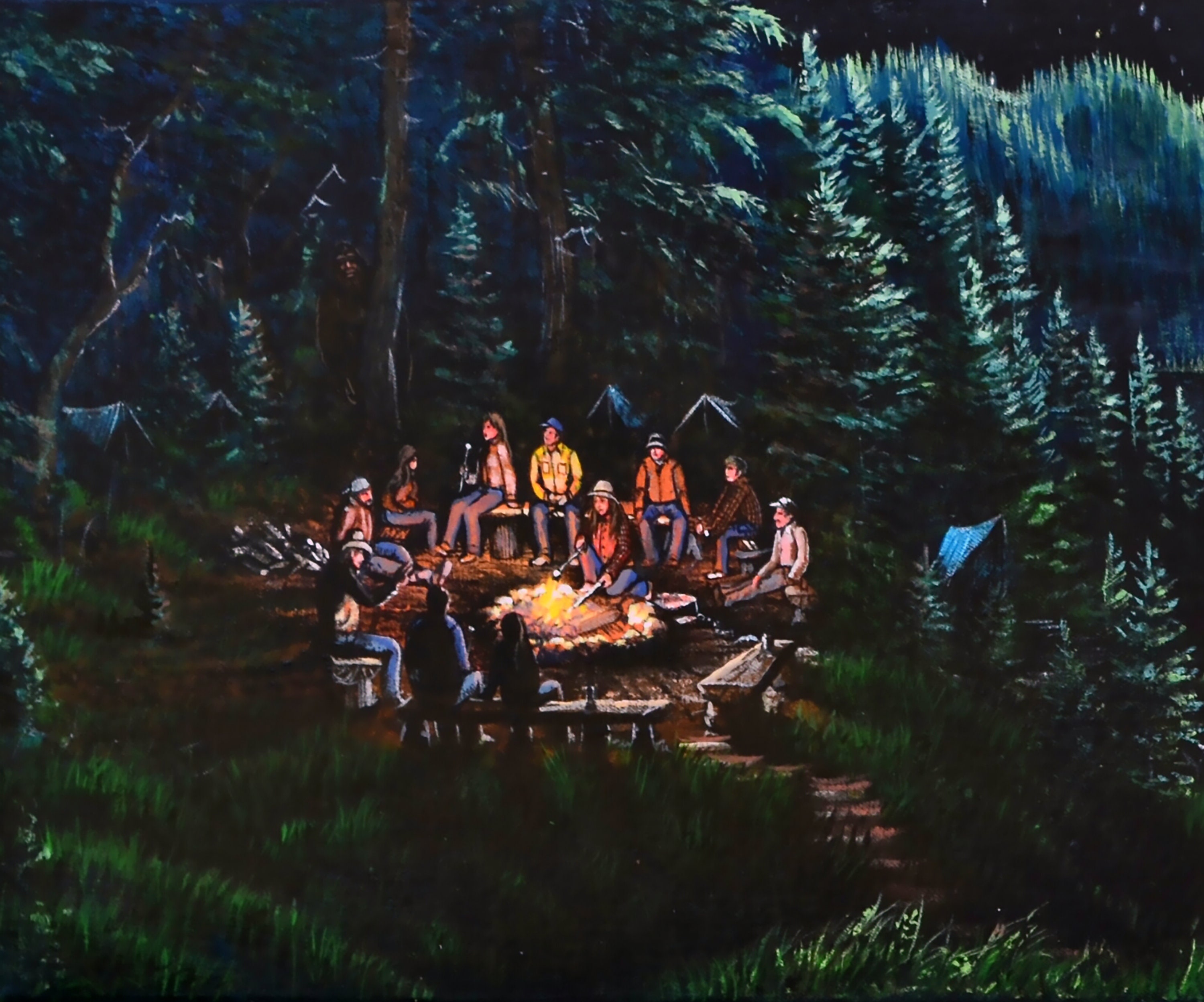 Description: A little girl wanders off from the campsite with her dog and encounters a Sasquatch. She gives the Sasquatch a small gift as a sign of friendship.
